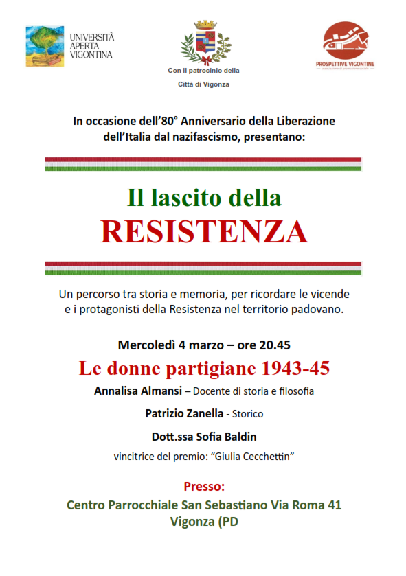 Il 4 marzo alle ore 20:45 presso il Centro parrocchiale San Sebastiano sito in via Roma, 41 a Vigonza, le associazioni “Prospettive Vigontine” e l'”Università Aperta Vigontina” con il patrocinio della Città di Vigonza, presentano il seminario “Le donne partigiane 1943 -45 “.