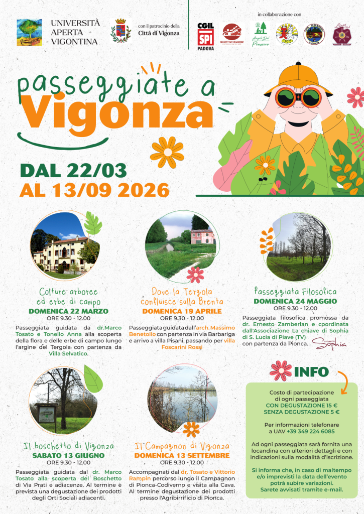 L’Università Aperta Vigontina organizza una serie di passeggiate culturali nel territorio vigontino, che si svolgeranno dal 22 marzo al 13 settembre 2026, con esperti che ci guideranno alla scoperta dei tanti tesori nascosti che ci circondano.