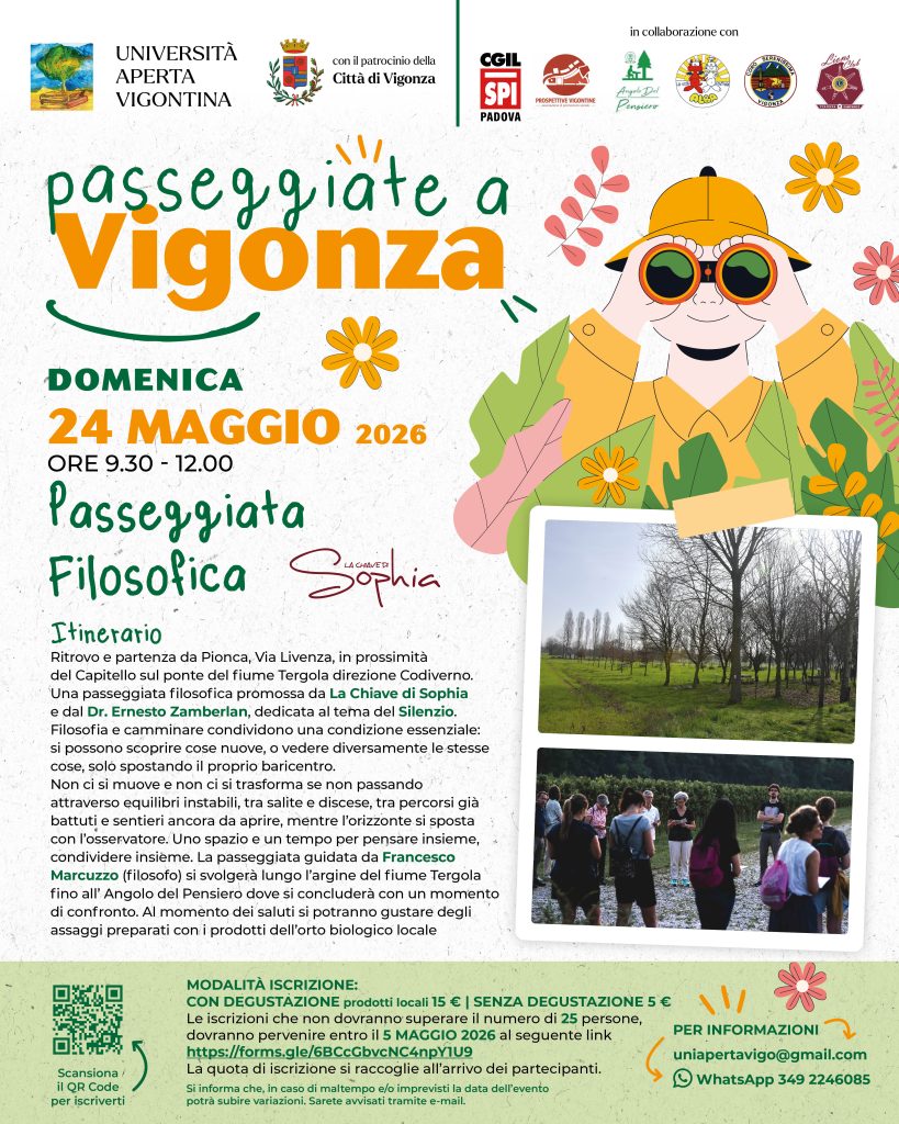 - La passeggiata guidata da Francesco Marcuzzo (filosofo) si svolgerà lungo l’argine del fiume Tergola fino all’ Angolo del Pensiero dove si concluderà con un momento di confronto.