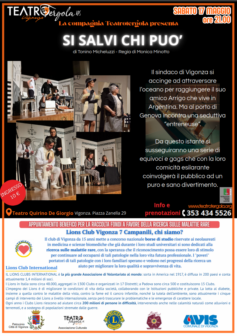 Biglietti: 9 € intero 7 € ridotto over 65 , studenti under 19 soci AVIS ,iscritti AIDO, iscritti alle associazioni del territorio . Gratuito persone con disabilità e bambini fino ai 10 anni. Info e prenotazioni: ☎353 4345526 📧teatrotergola2008@libero.it